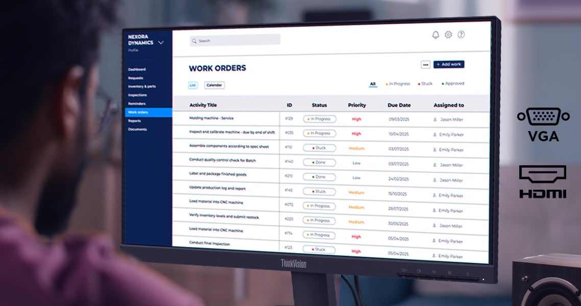 Connecting to your work computer is easy using the monitor’s HDMI and VGA ports.