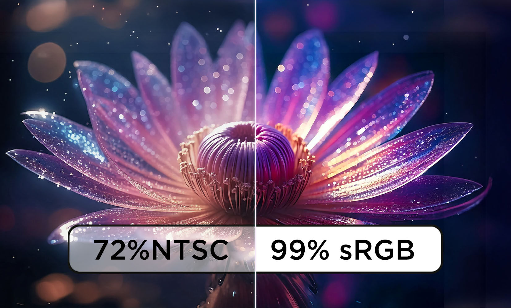 Experience clear content with 99% sRGB color space coverage and 1300:1 contrast ratio.